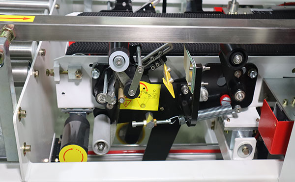 其次,封箱機(jī)的機(jī)械調(diào)整部件也會(huì)影響膠帶的走向。封箱機(jī)的壓帶裝置和切刀位置如果調(diào)整不當(dāng),可能會(huì)導(dǎo)致膠帶在封箱過程中偏離預(yù)定軌道。檢查壓帶裝置是否牢固,切刀位置是否準(zhǔn)確,以及機(jī)械部件是否有松動(dòng)或損壞,這些都可以有效避免膠帶跑偏的問題。