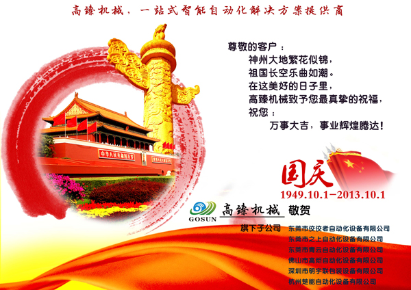 國慶節來臨之際,東莞市高臻智能自動化設備有限公司祝大家假期愉快。 在國慶小長假中高臻智能公司送上一份祝福:國慶節到了,黃金周來了,再忙也該歇歇了,心情變爽了,天氣變好了,也該出去走 走了,行李帶好了,朋友約少了,你能加入就更好了。祝大家前程似錦、健康快樂。_高臻智能貼標機
